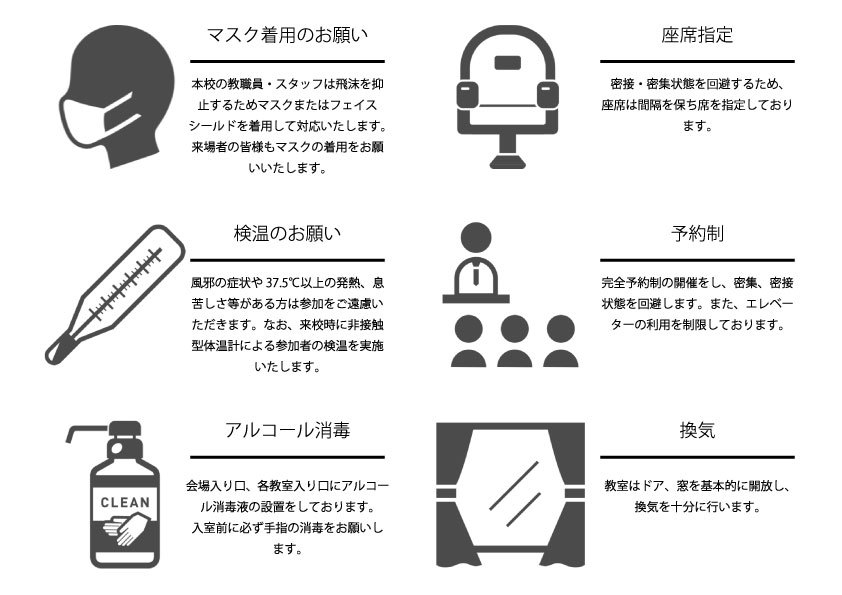 参加の際はマスクの着用、手洗い・消毒、検温のご理解・ご協力をお願いいたします。