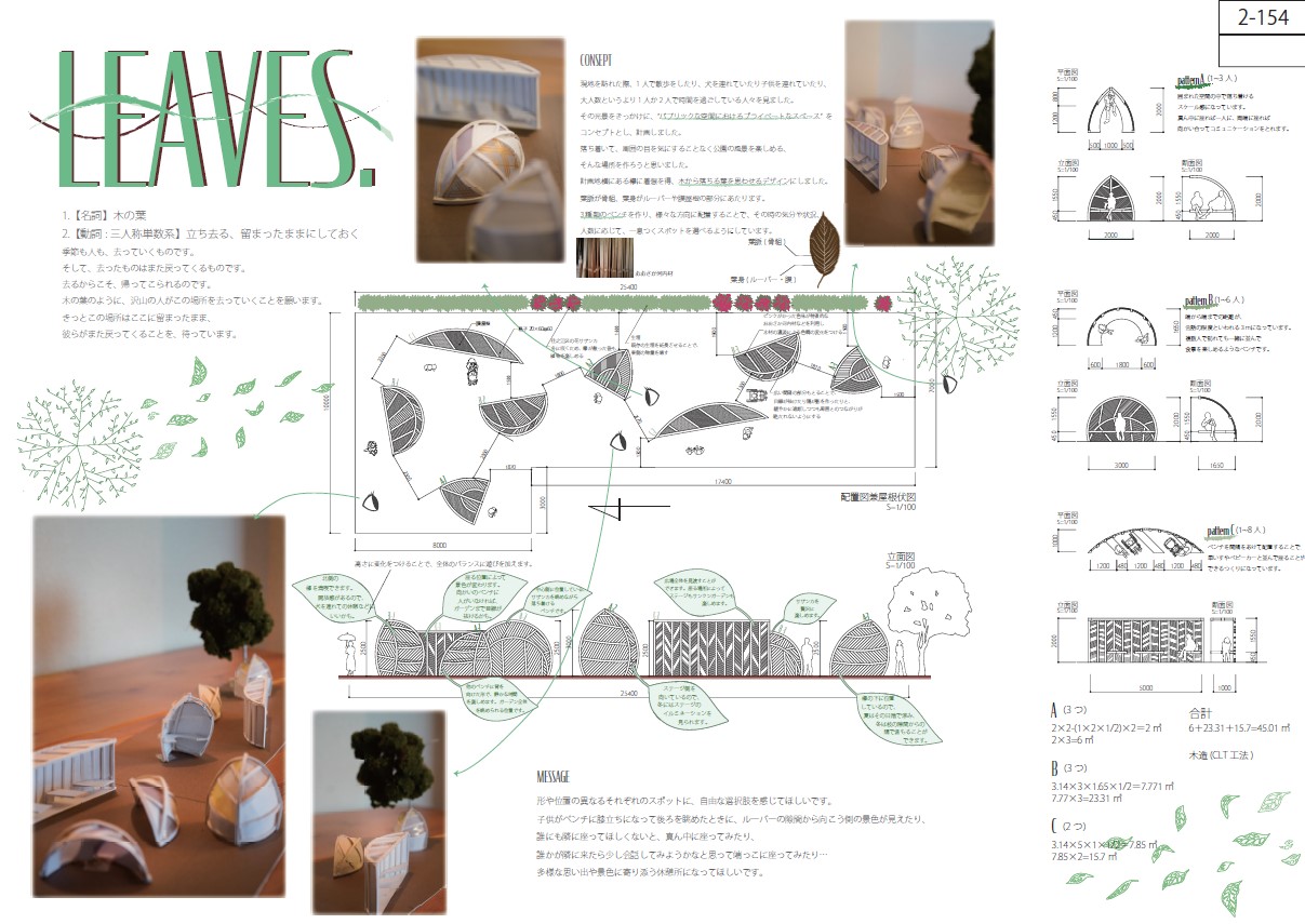 様々なシーンの利用形態を考え、3種類の休憩所が織りなす空間が面白く、木の葉をモチーフにして作り出した形態の造形センスを評価した。管理上の懸念として、公共の公演では死角がないことが求められており、その点を解決できればより良い作品に仕上がったと思われる。
