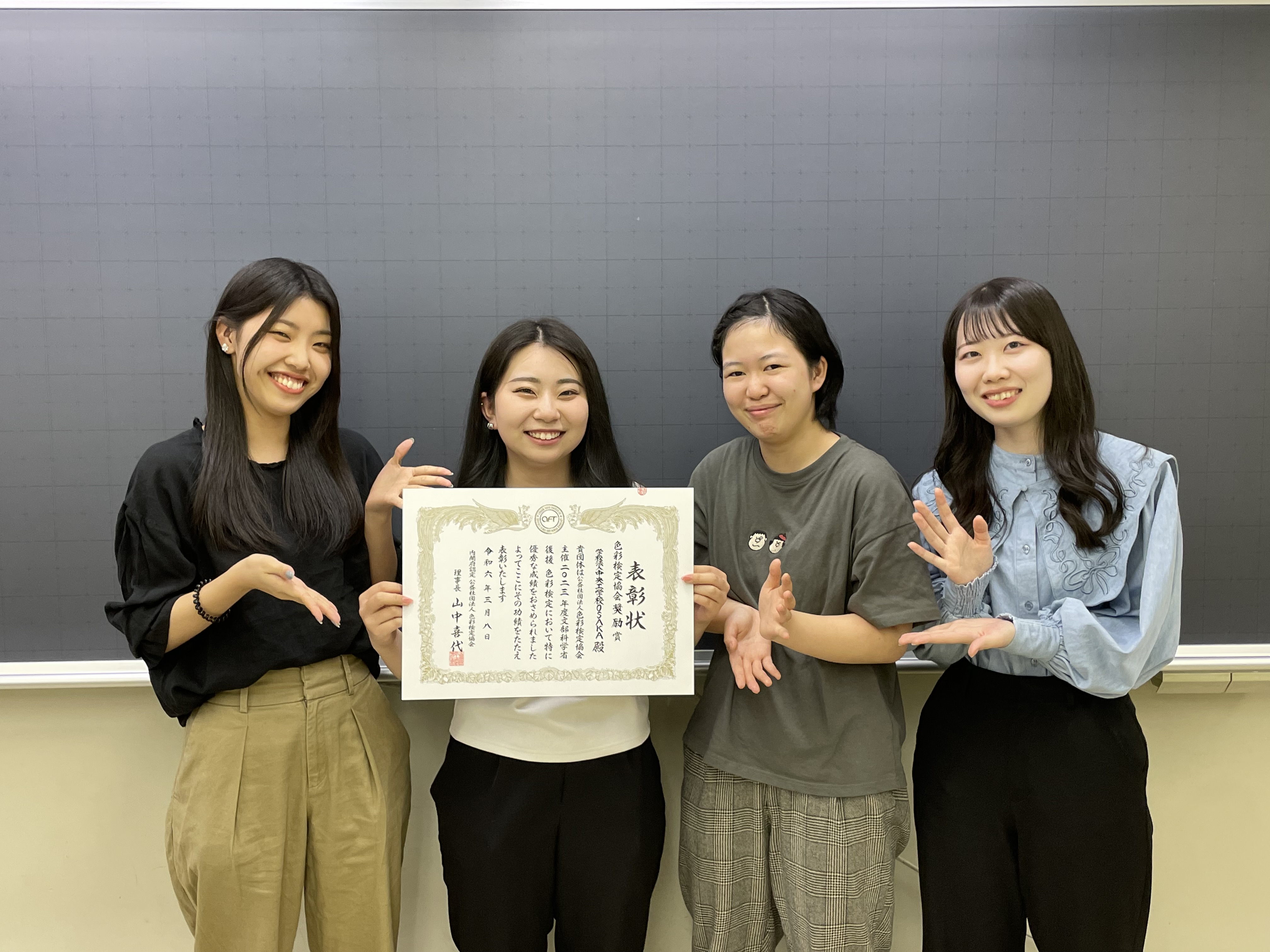 2024.05.27 お知らせ 色彩検定協会奨励賞を受賞しました! 2023年度 「色彩検定協会奨励賞」を受賞しました! この賞は、年2回実施される『色彩検定(文部科学省後援)』において、特に優秀な成績を修められた個人および団体に贈られるものです。 公益社団法人色彩検定協会のWEBページはこちら 建築やインテリア業界で活用できる色彩検定は本校の資格・検定対策授業の一つであり、1年次に2級・3級の合格を目指します。実際にデザインの第一線で活躍するプロの講師が色彩の基礎知識はもちろん、現場を想定したカラー計画やお客様へのプラン提案など実践力が身に付くよう少人数制できめ細かく指導しています。