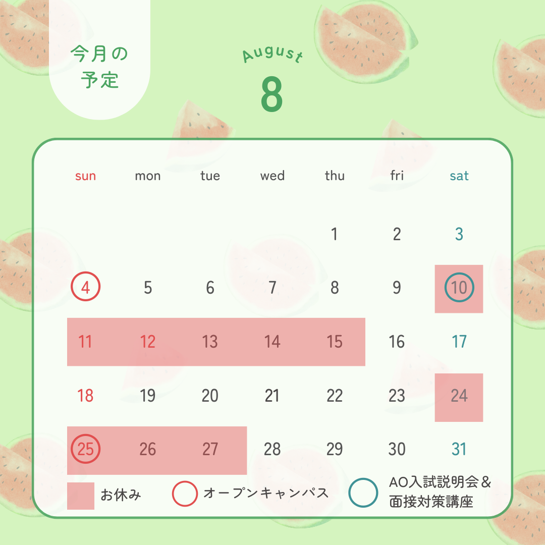夏季休業期間 8月10日(土)~8月15日(木)