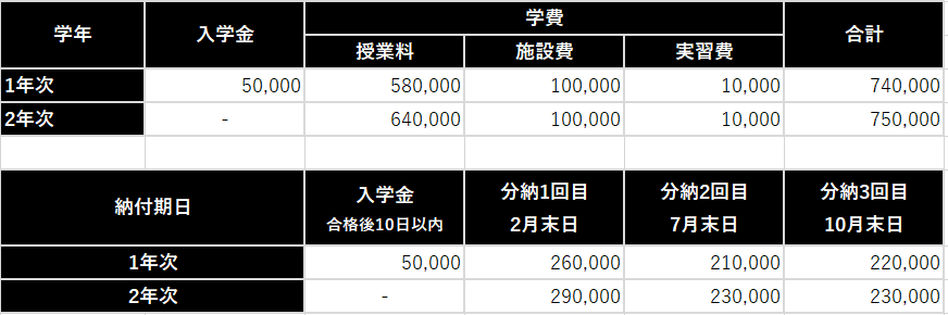 学校の学費は大阪の一般的な専門学校と比較して平均的です。